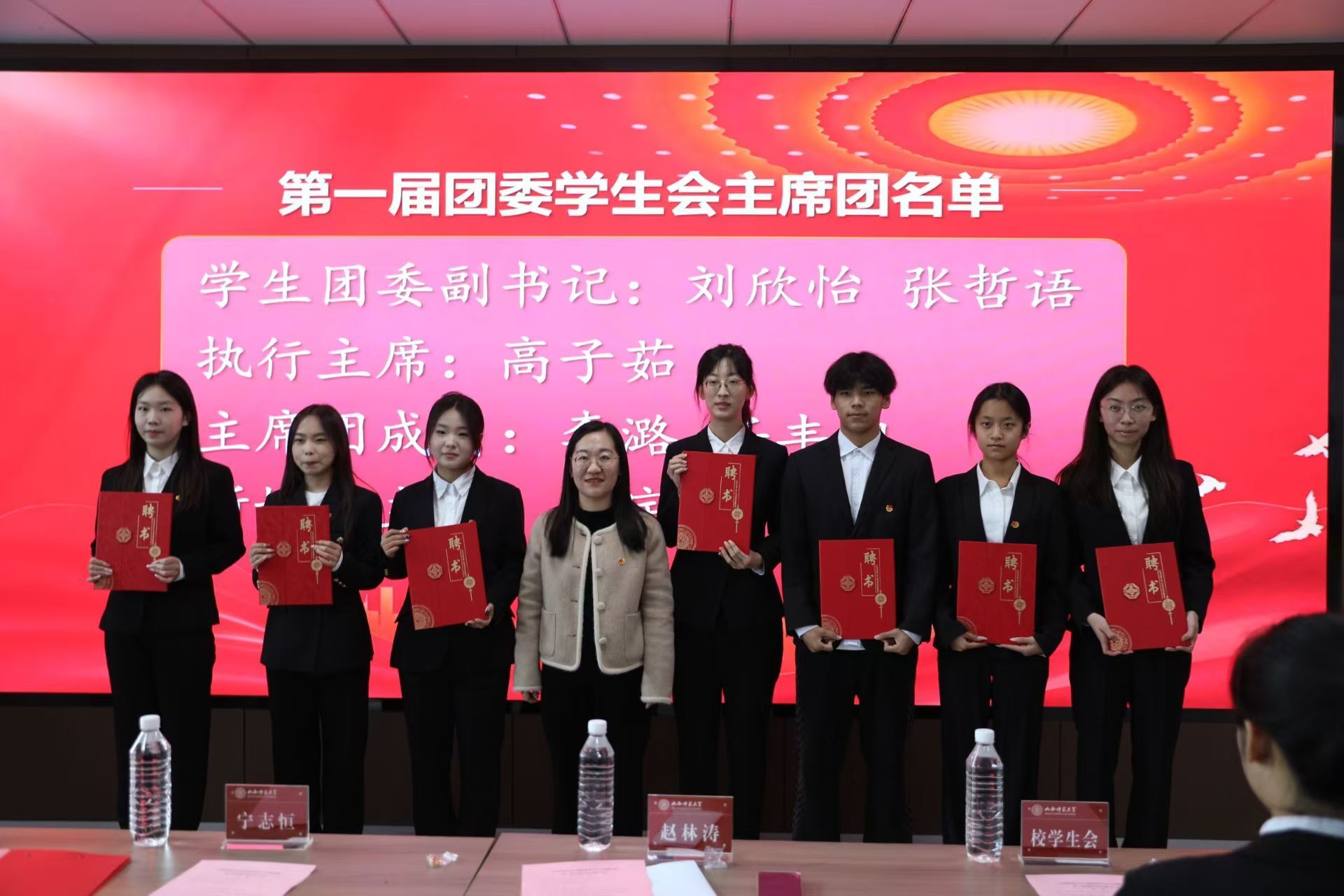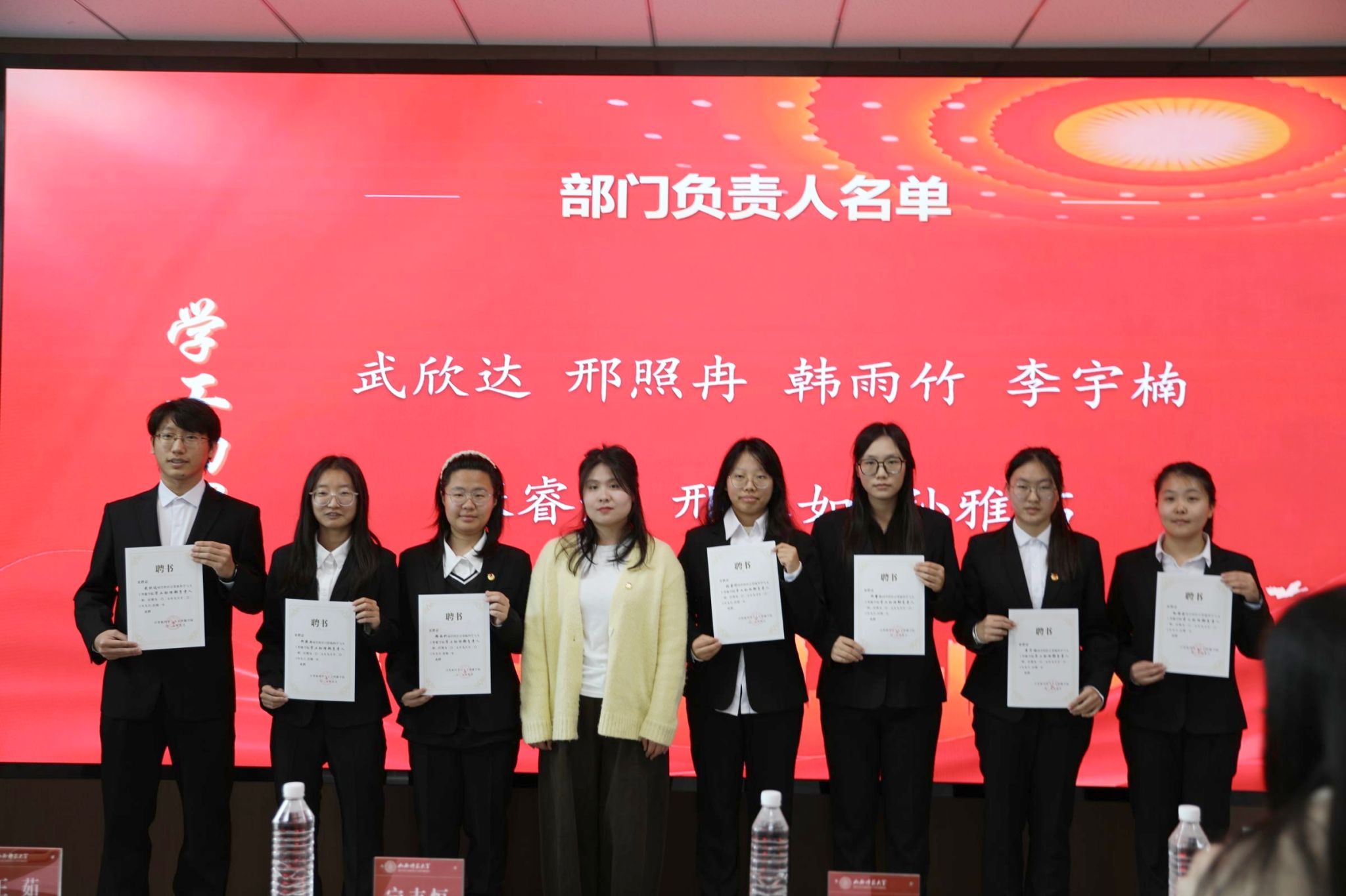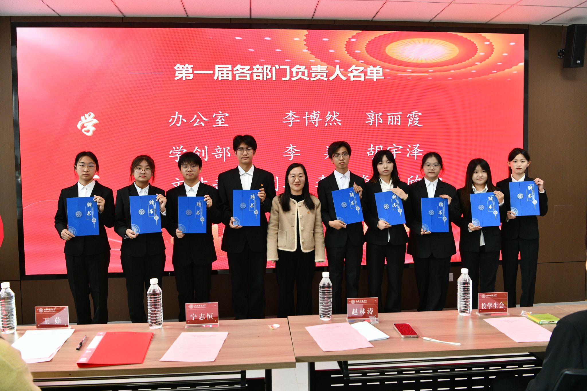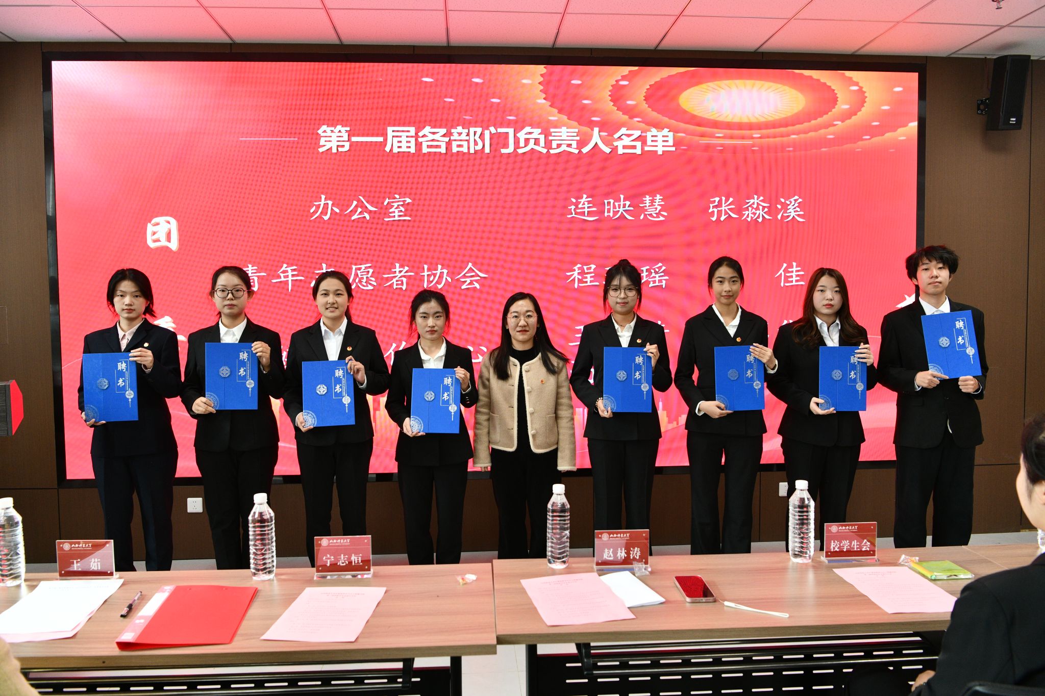 随后,赵林涛老师、王茹老师分别宣读了第一届团委员工会主席团成员及各部门负责人名单、学工助理部及社团负责人名单并颁发聘书。