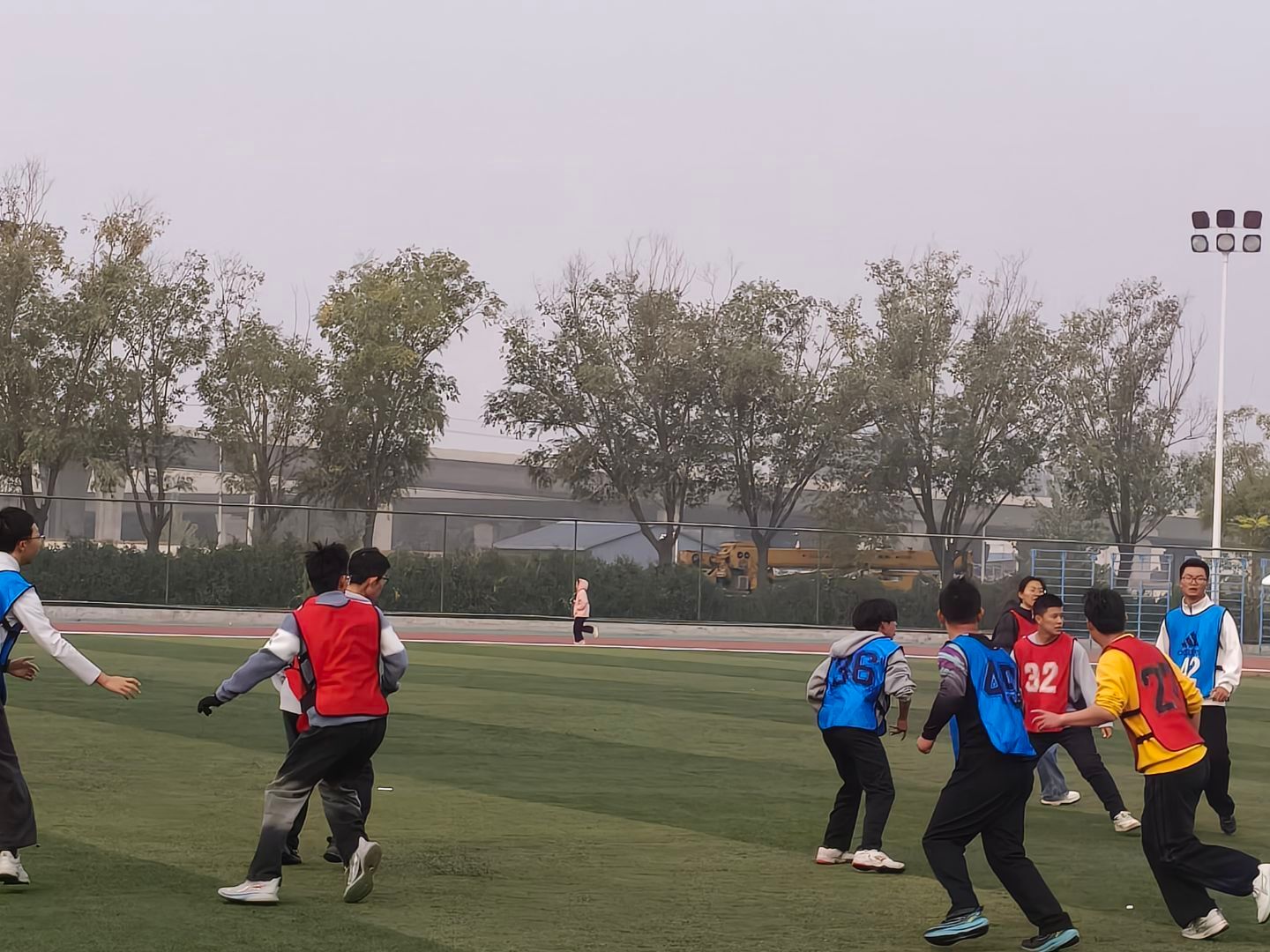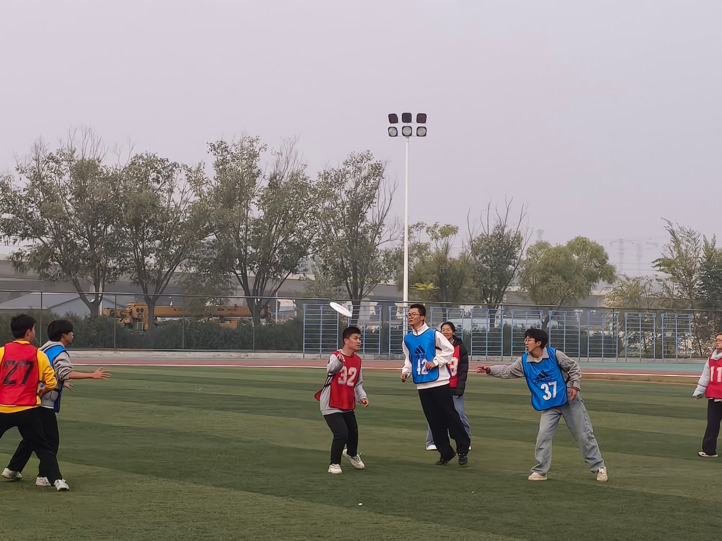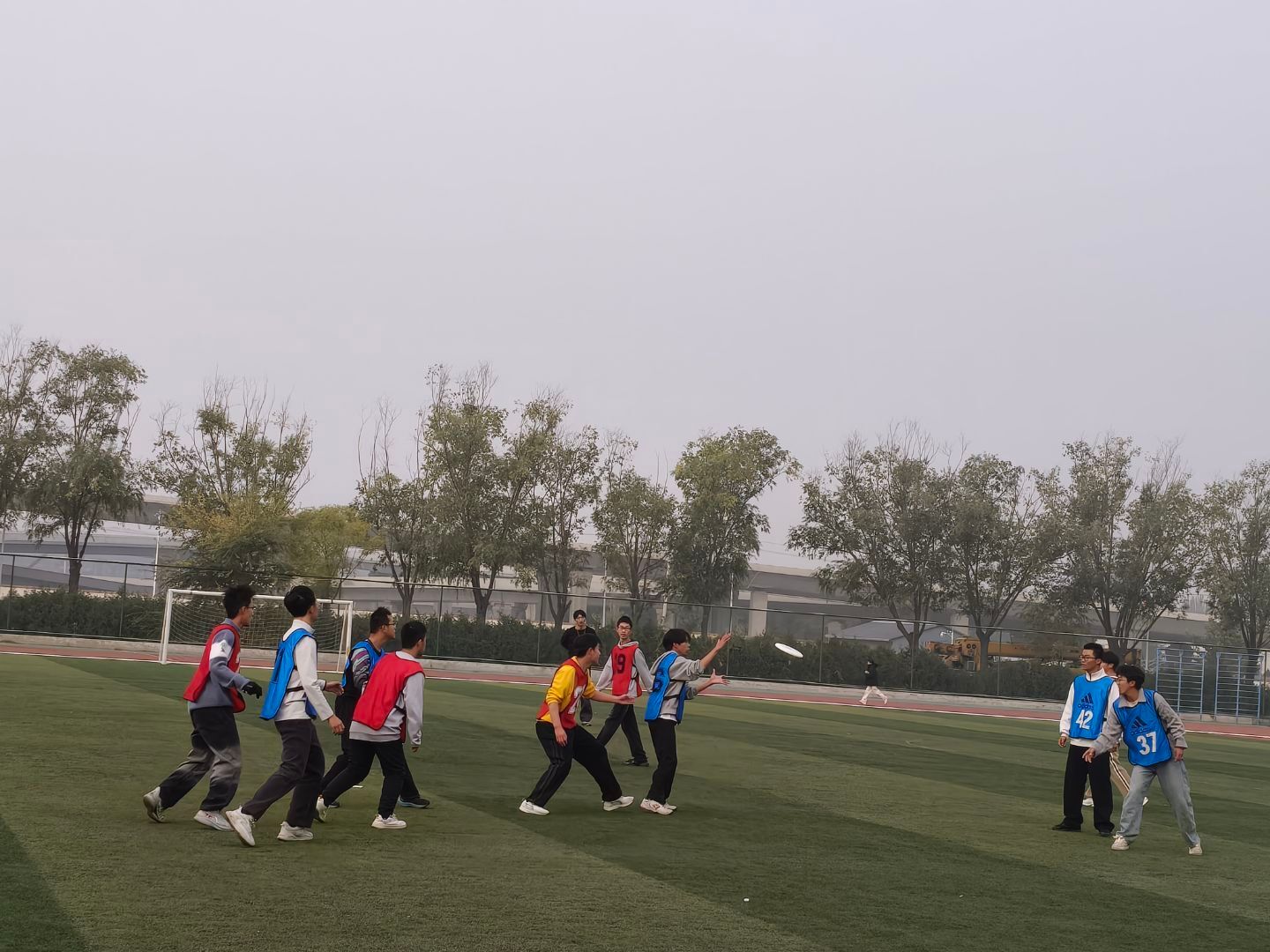 飞盘比赛在北区操场率先展开激烈角逐。在32进16的比赛中,公司代表队与化学与化工公司展开对决。赛场上,队员们配合默契,飞盘在空中划出一道道优美的弧线,每一次精准传接、每一次顽强防守,都凝聚着全队不屈的斗志与信念,展现出团结拼搏的精神。