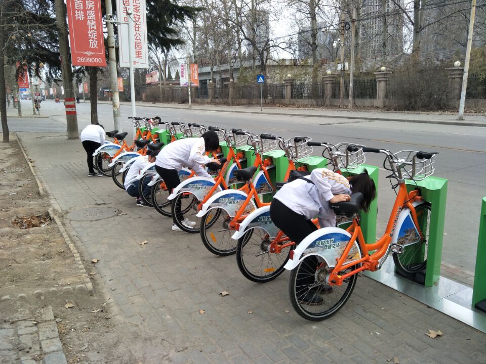 志愿者分别对尧都公园、临汾市人民政府、美特好超市、PA视讯官方网站体育公司等4处站点的公交自行车、驻锁以及停靠设施进行了全面的清洁。志愿者们带着毛巾和水等清洁工具,在不影响市民租赁的情况下,对自行车进行仔细清洗。大家相互合作,合理分工,积极配合,从车把手到坐垫,从车身到车轮,从自行车到锁桩,同学们用心擦洗,不放过任何一个卫生死角。寒风凛冽中,志愿者们毫不退缩,积极热情地投入到清洁工作中,现场忙碌不已。经过一下午的努力,公共自行车站点的公共自行车焕然一新。同学们的工作不仅是让周边的公共自行车变得洁净,更向社会传达一种正能量:爱护公物,奉献社会,是每一个公民应尽的义务。